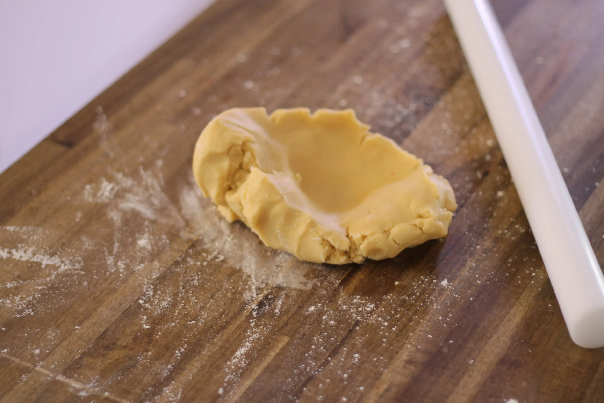Crumb butter, salt, flour. Add egg and icing sugar, combine to form the pastry. Flatten, wrap and Refrigerate 1 hour. Roll out to 2mm thickness. Cut 10cm diameter rings, line egg rings, prick bases and blind bake 160C 10-12mins.
