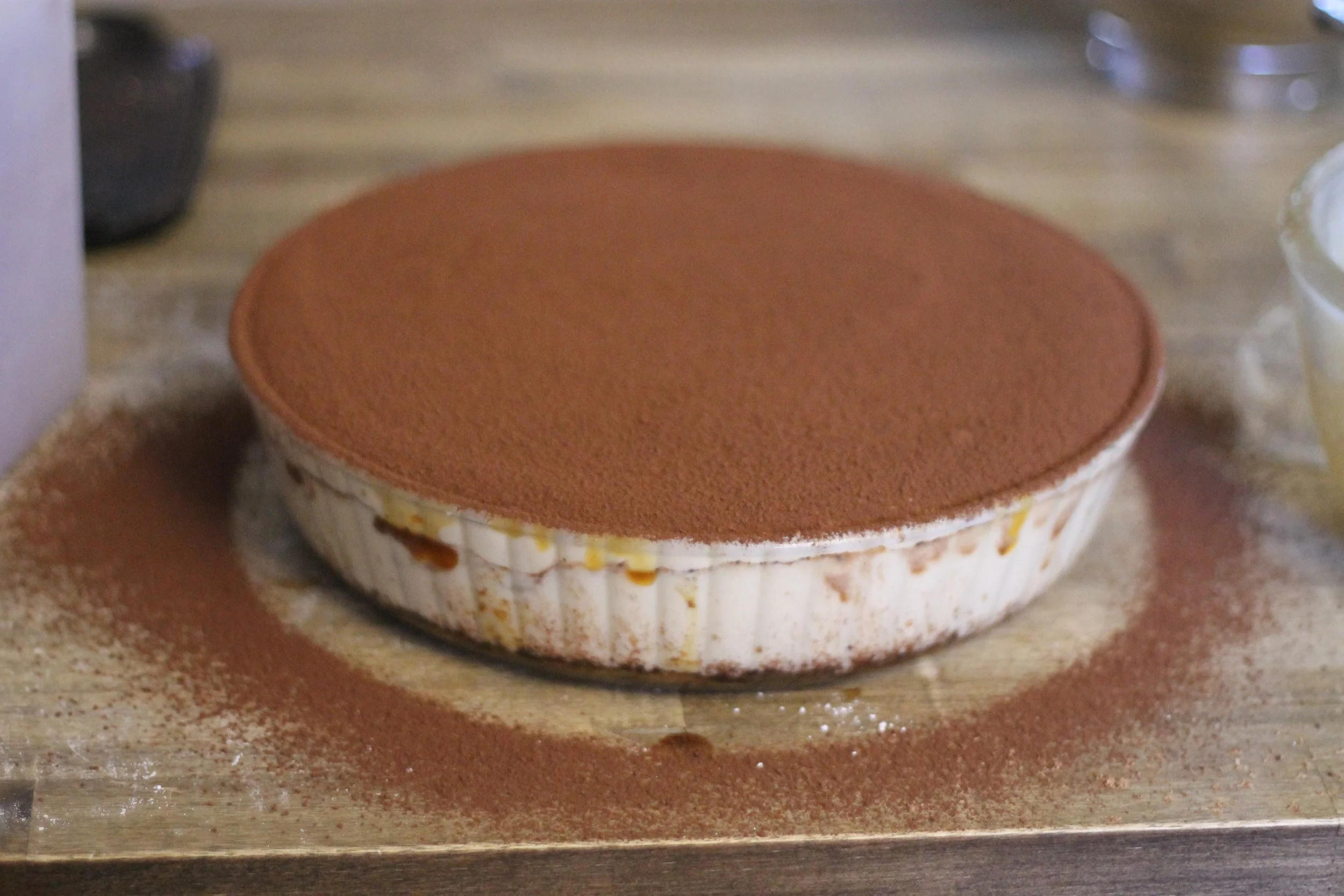 soaking syrup, ladyfinger biscuit slab, soaking syrup, caramel, cocoa powder dusting, grated chocolate, mascarpone cream, ladyfinger biscuit slab, soaking syrup, caramel, cocoa, mascarpone cream, cocoa powder dusting