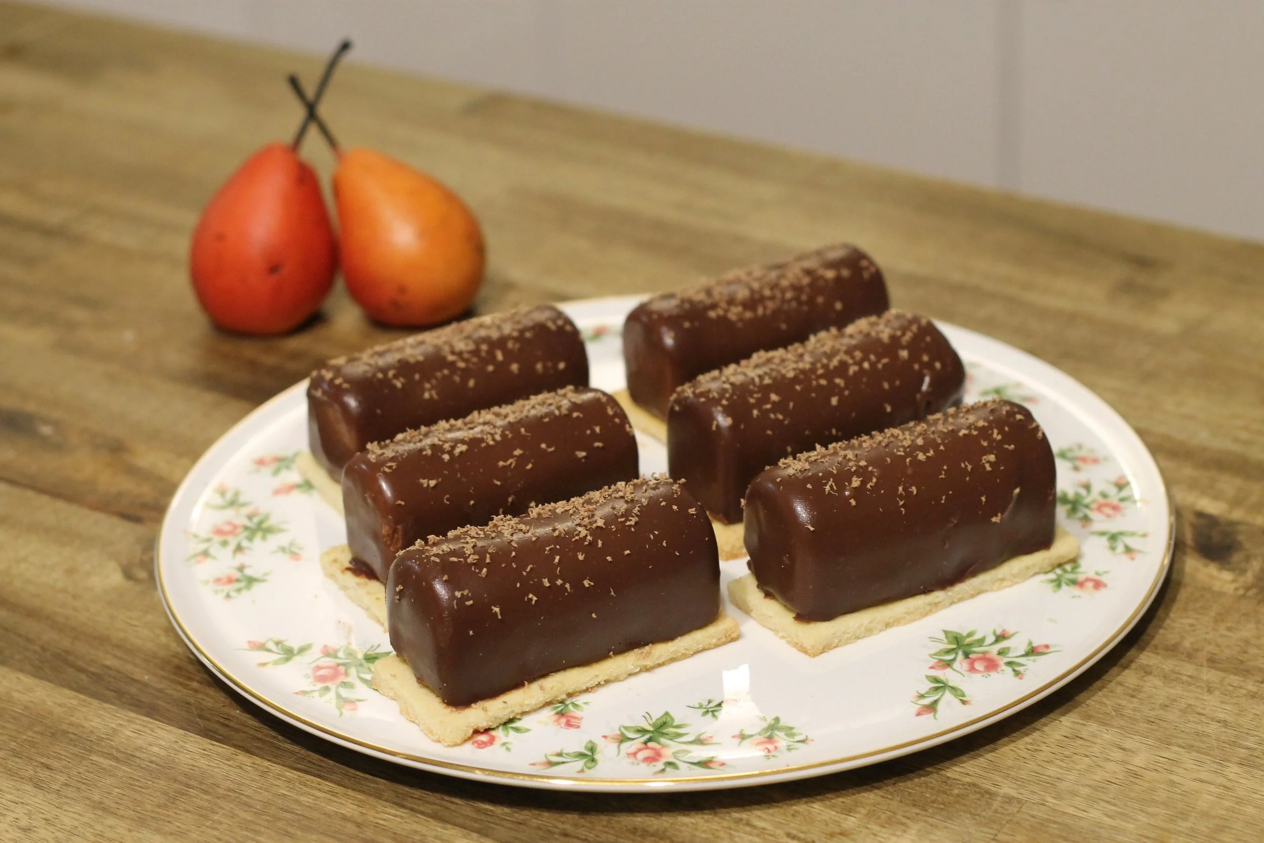 Ensure your inserts are frozen solid before you start your mousse. Whip cream (b) to soft peaks and set aside in the fridge. Place chocolate in a bowl with a strainer handy and set aside on the bench while we make anglaise. Use a small saucepan, heat the milk and cream (a). In a bowl whisk together the egg yolks and sugar, pour a little hot milk into the eggs while whisking to temper. pour the egg mix into the saucepan. Heat on medium, stirring constantly with a spatula. Use a digital thermometer to heat the mix to 82C, immediately remove from heat and pour through the strainer onto your chocolate. Rest for 2 minutes then stir to make ganache. Cool ganache to about 30C then fold through the whipped cream. Transfer to a piping bag and start filling your petit gateaux moulds about 1cm with mousse. Unmould your inserts and place in each new mould with the mousse. Add more mousse, ensuring it covers the insert completely on all sides. Now place your sponge in and smooth out the moulds with an offset spatula. Return to the freezer overnight.