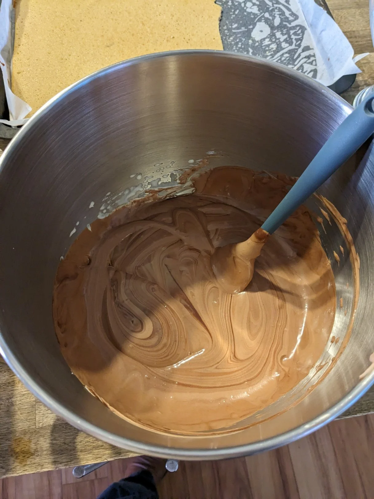 combine everything in group 1, fold through the butter, whip egg whites (b) with brown sugar (b) to a meringue, fold through carefully. Distribute 350g of mix per tray, spread evenly and bake in a fan oven at 160C for 10 minutes. Cut to the size of your silicone mould inserts.